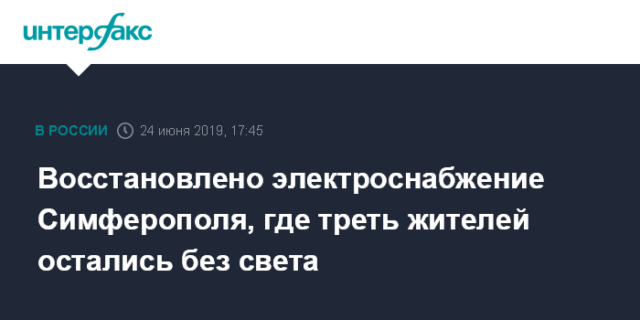 Москва. 24 июня. INTERFAX.RU - Энергетики восстановили электроснабжение потребителей Симферополя, в котором, по разным данным, от 70 до 100 тысяч человек остались в понедельник без света.