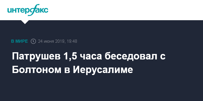 Москва. 24 июня. INTERFAX.RU - Встреча секретаря Совета безопасности РФ Николая Патрушева с помощником президента США Джоном Болтоном завершилась в Иерусалиме. Беседа продлилась полтора часа.