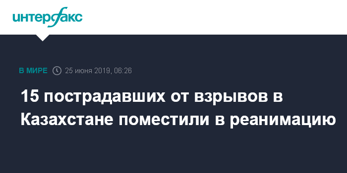 Москва. 25 июня. INTERFAX.RU - В реанимационных отделениях больниц Шымкента и Туркестанской области находятся 15 человек, пострадавших в результате взрывов на складе воинской части в городе Арысь, сообщил глава Минздрава Казахстана Елжан Биртанов.