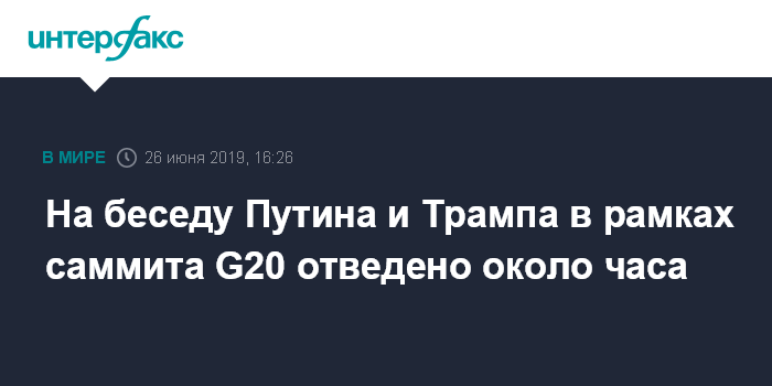 Москва. 26 июня. INTERFAX.RU - Беседа президента РФ Владимира Путина с президентом США Дональдом Трампом "на полях" саммита G20 в Осаке запланирована ориентировочно на 14:00 28 июня, продлится около часа, пройдет с участием президентских команд, сообщил журналистам помощник президента РФ Юрий Ушаков.