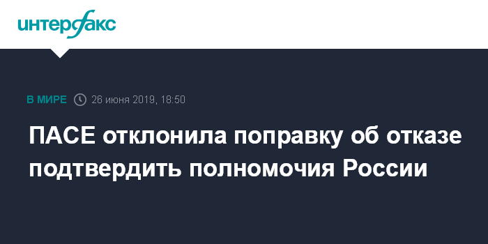 Москва. 26 июня. INTERFAX.RU - ПАСЕ отклонила поправку к проекту резолюции о подтверждении полномочий российской делегации, в соответствии с которой предлагалось отказать России в восстановлении полномочий делегации в ассамблеи.