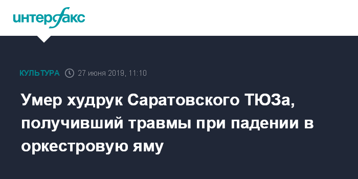 Москва. 27 июня. INTERFAX.RU - Художественный руководитель Саратовского театра юного зрителя Юрий Ошеров скончался через десять дней после падения в оркестровую яму, сообщили в четверг "Интерфаксу" в региональном Минкультуры.