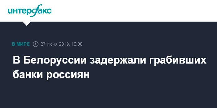 Москва. 27 июня. INTERFAX.RU - Двое граждан РФ, подозреваемых в серии налетов на российские банки, задержаны в Минске, сообщили в четверг в белорусском МВД.