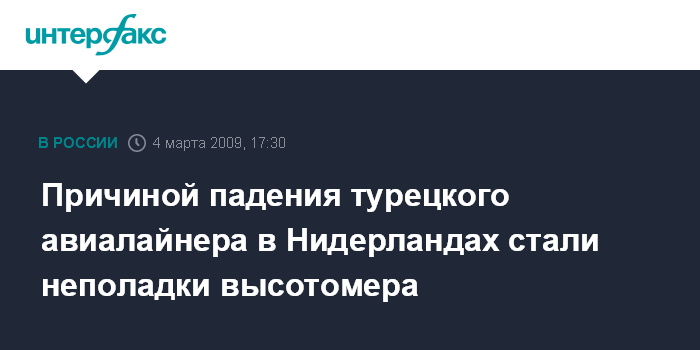 Москва. 4 марта. INTERFAX.RU - Катастрофа турецкого авиалайнера, которая произошла 25 февраля близ амстердамского аэропорта "Схипхол", была вызвана неполадками высотомера. Такое заключение сделала голландская комиссия, расследовавшая причины происшествия.