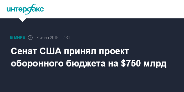 Москва. 28 июня. INTERFAX.RU - Сенат США принял проект оборонного бюджета в $750 млрд на 2020-й финансовый год.