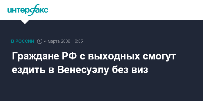 Соглашение между правительствами двух стран об отказе от визовых формальностей при взаимных поездках граждан двух государств, подписанное в Каракасе 26 ноября 2008 г., вступает в силу 6 марта 2009 года, говорится в сообщении для СМИ, опубликованном на сайте российского внешнеполитического ведомства в среду.