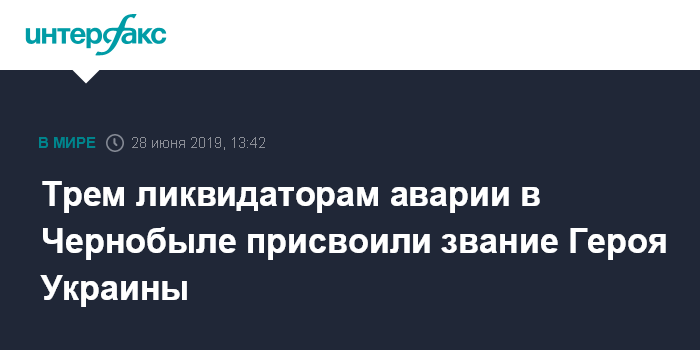 Москва. 28 июня. INTERFAX.RU - Президент Украины Владимир Зеленский присвоил звание "Герой Украины" трем ликвидаторам аварии на Чернобыльской АЭС - Алексею Ананенко, Валерию Беспалову и Борису Баранову; всем троим присужден орден "Золотая звезда", Баранову - посмертно.