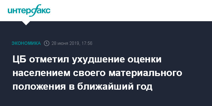 Москва. 28 июня. INTERFAX.RU - В июне ухудшились оценки населением своего материального положения в ближайший год и перспектив развития страны, говорится в комментарии Банка России "Инфляционные ожидания и потребительские настроения". Регулятор использовал данные опроса "ИнФОМ".