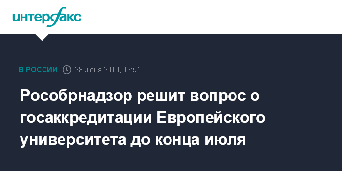 Москва. 28 июня. INTERFAX.RU - Рособрнадзор примет решение по государственной аккредитации Европейского университета в Санкт-Петербурге до конца июля, следует из ответа пресс-службы ведомства на запрос "Интерфакса".