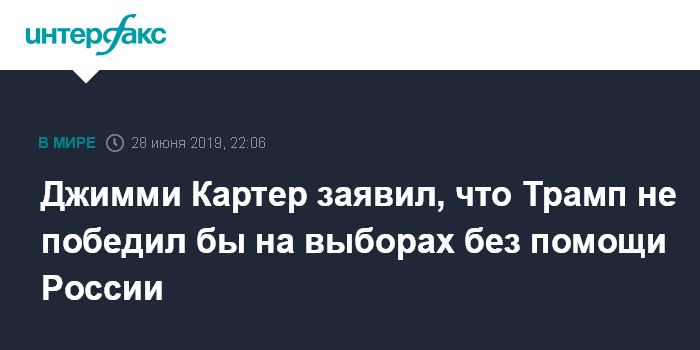 Москва. 28 июня. INTERFAX.RU - Бывший президент США Джимми Картер заявил, что нынешний американский лидер Дональд Трамп не одержал бы победу на президентских выборах 2016 года без вмешательства России, сообщает в пятницу издание The Hill.