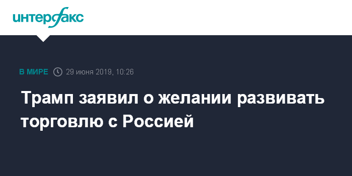 Москва. 29 июня. INTERFAX.RU - Президент США Дональд Трамп заявил, что хотел бы развивать торговлю с Россией, которая в настоящее время находится на очень низком уровне.