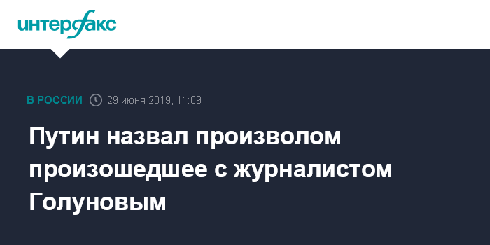 Москва. 29 июня. INTERFAX.RU - Президент РФ Владимир Путин назвал произволом ситуацию с задержанием журналиста Ивана Голунова и подчеркнул, что этот инцидент должен быть расследован.