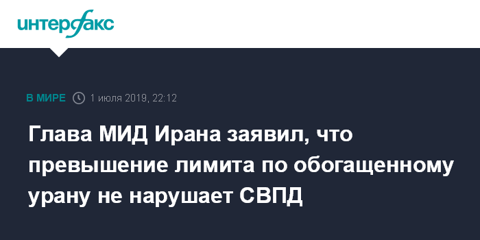 Москва. 1 июля. INTERFAX.RU - Решение Ирана превысить максимально разрешенный лимит запасов обогащенного урана не нарушает Совместный всеобъемлющий план действий (СВПД), так как вытекает из его положений, заявил в понедельник глава иранского МИД Джавад Зариф.