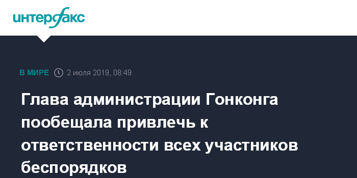 Глава администрации Гонконга пообещала привлечь к ответственности всех участников беспорядков