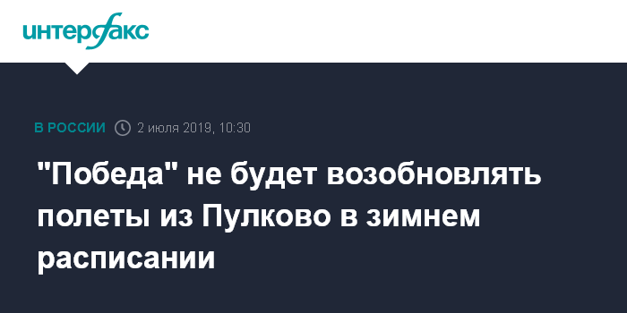 Москва. 2 июля. INTERFAX.RU - Авиакомпания "Победа" (входит в группу "Аэрофлот") не планирует возобновлять авиарейсы из петербургского аэропорта "Пулково", сообщил "Интерфаксу" официальный представитель компании.