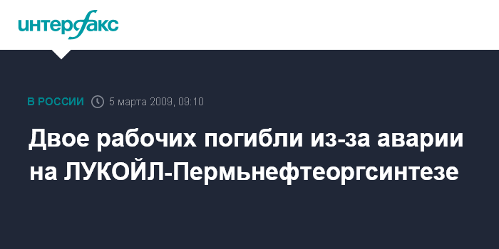 Москва. 5 марта. INTERFAX.RU - Двое рабочих нефтеперерабатывающего завода ООО "ЛУКОЙЛ-Пермьнефтеоргсинтез" (Пермский НПЗ) погибли и один госпитализирован в результате выброса сероводорода, сообщил "Интерфаксу" источник в правоохранительных органах.