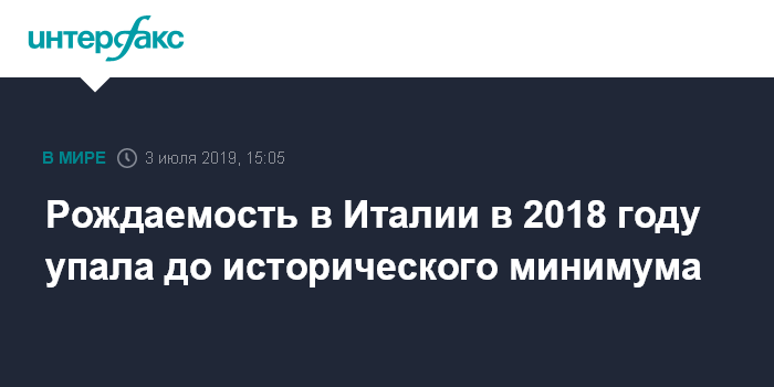 Москва. 3 июля. INTERFAX.RU - Число новорожденных в Италии в 2018 году стало самым низким с 1861 года, когда было образовано государство, а население страны оказалось самым старым в мире после японцев, следует из данных итальянского статистического ведомства Istat.