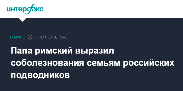 Москва. 3 июля. INTERFAX.RU - Папа римский Франциск выразил соболезнования семьям российских подводников, погибших близ Североморска.