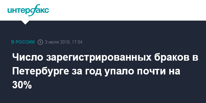 Москва. 3 июля. INTERFAX.RU - В Петербурге число зарегистрированных в 2019 году браков уменьшилось на 29% по сравнению с аналогичным периодом прошлого года - до 8,5 тысяч, сообщил журналистам в среду председатель городского комитета по социальной политике Александр Ржаненков.