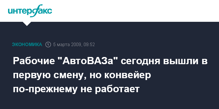 Москва. 5 марта. INTERFAX.RU - Первая смена рабочих ОАО "АвтоВАЗ" утром в четверг вышла на работу, но главный конвейер предприятия по-прежнему не запущен, сообщили "Интерфаксу" в пресс-службе автозавода.