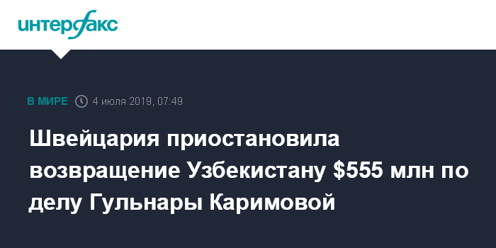 Москва. 4 июля. INTERFAX.RU - Власти Швейцарии приостановили возвращение Узбекистану $555 миллионов долларов, конфискованных по делу, связанному с Гульнарой Каримовой, дочерью первого президента страны, сообщил в четверг в твиттер ее адвокат Грегори Манжа.