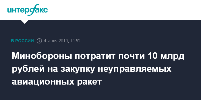 Москва. 4 июля. INTERFAX.RU - Минобороны РФ в 2019-2021 годах потратит 9,7 млрд рублей на закупку неуправляемых ракет "воздух-земля" С-8КОМ, следует из материалов портала госзакупок.