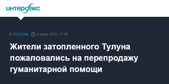 Москва. 4 июля. INTERFAX.RU - Жители иркутского города Тулун, затопленного вышедшей из берегов рекой Ия, пожаловались на случаи перепродажи гуманитарной помощи, собранной для пострадавших от наводнения, рассказал в четверг председатель правительства региона Руслан Болотов.