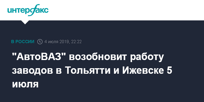 Москва. 4 июля. INTERFAX.RU - Группа "АвтоВАЗ" возобновит работу своих предприятий в Тольятти и Ижевске с 5 июля, говорится в сообщении автопроизводителя.