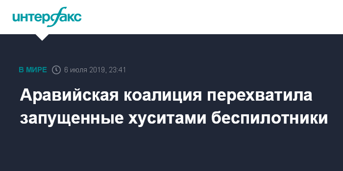 Москва. 6 июля. INTERFAX.RU - Коалиция, возглавляемая Саудовской Аравией, уничтожила беспилотники хуситов, запущенные в сторону аэропортов саудовских городов Абха и Джизан, сообщило в субботу Саудовское агентство печати.