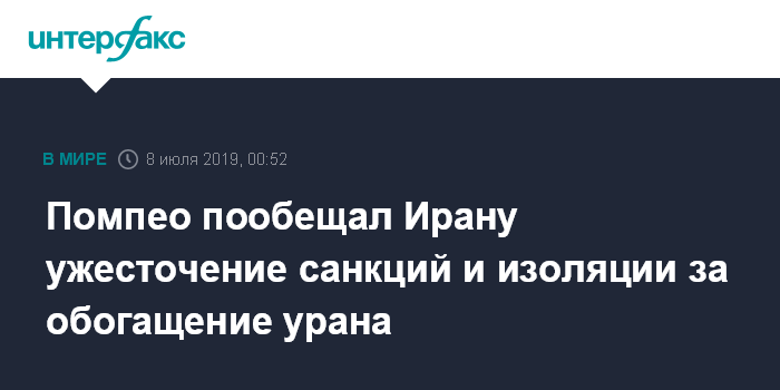 Москва. 8 июля. INTERFAX.RU - Вашингтон введет новые санкции против Тегерана и усилит его изоляцию в ответ на "расширение ядерной программы", написал в твиттере госсекретарь США Майк Помпео.