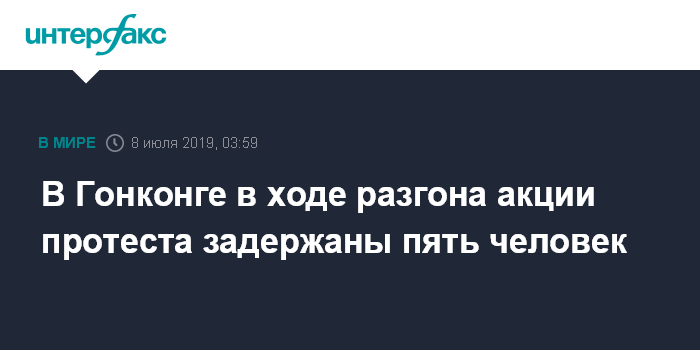 Москва. 8 июля. INTERFAX.RU - В Гонконге по меньшей мере пять человек были задержаны во время разгона полицией акции протеста против поправок к закону об экстрадиции, сообщает RTHK.