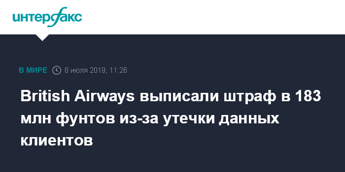 Москва. 8 июля. INTERFAX.RU - Авиакомпанию British Airways оштрафуют на 183,4 млн фунтов стерлингов ($230 млн) за утечку данных ее клиентов, произошедшую в прошлом году.