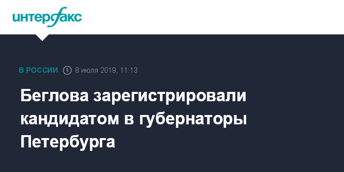 Москва. 8 июля. INTERFAX.RU - Санкт-Петербургская избирательная комиссия приняла решение зарегистрировать Александра Беглова кандидатом в губернаторы на сентябрьских выборах главы города, сообщили "Интерфаксу" в пресс-службе Горизбиркома в понедельник.