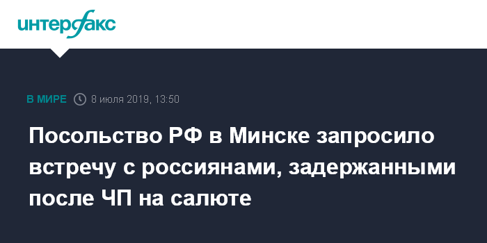 Москва. 8 июля. INTERFAX.RU - Посольство РФ в Белоруссии запросило встречу с двумя россиянами, задержанными по делу о взрывах на салюте в Минске, в результате которых погибла женщина; об этом в понедельник сообщили в пресс-службе дипмиссии.