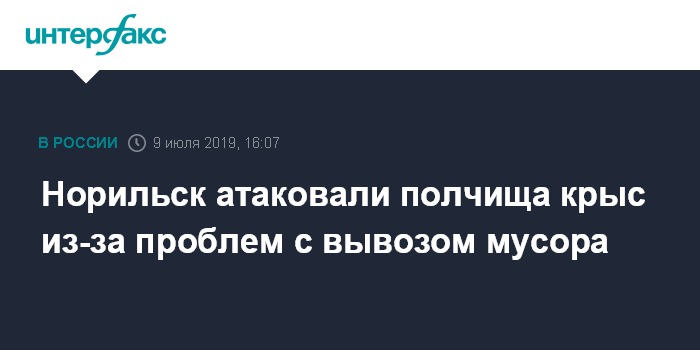 "Жители города Норильска обратили внимание на увеличение числа крыс (...) Несмотря на то, что СанПиНами предусмотрена дератизация в многоквартирных домах один раз в месяц, управляющие компании выполняют процедуру дважды в месяц, дополнительно работают по обращениям и жалобам жителей на конкретных адресах", - сообщила агентству "Интерфакс" и.о. начальника управления ЖКХ администрации города Татьяна Шульгина.