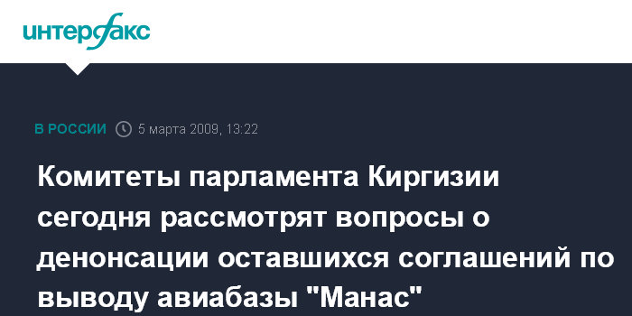Москва. 5 марта. INTERFAX.RU - Заседание парламентских комитетов по рассмотрению законопроектов о денонсации межправсоглашений с 11 странами антитеррористической коалиции, размещавших своих военнослужащих на авиабазе "Манас", состоится в четверг до конца дня.