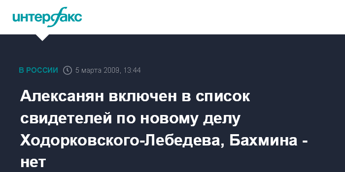 Москва. 5 марта. INTERFAX.RU - Бывший вице-президент НК "ЮКОС" Василий Алексанян фигурирует в списке свидетелей по новому уголовному делу Михаила Ходорковского и Платона Лебедева, а экс-юриста компании Светланой Бахминой в этом списке нет.