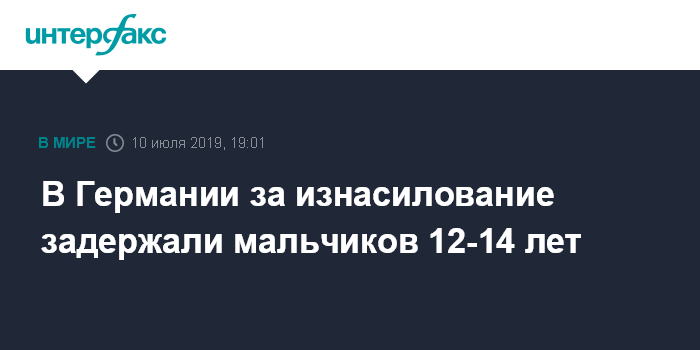 Москва. 10 июля. INTERFAX.RU - Пятеро несовершеннолетних задержаны в немецком городе Мюльхайм-ан-дер-Рур по подозрению в групповом изнасиловании, сообщает The Guardian, троим из них по 14 лет, еще двоим - 12.