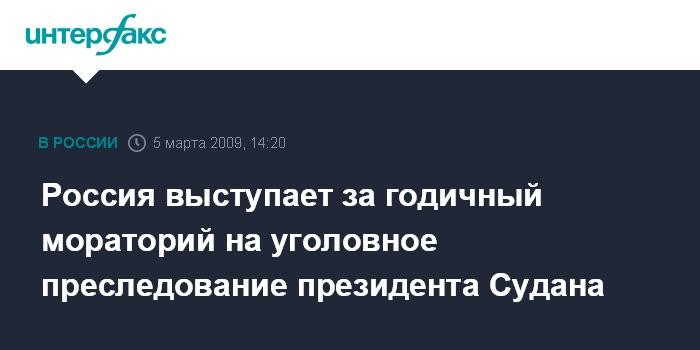 Москва. 5 марта. INTERFAX.RU – Россия поддерживает позицию ряда международных организаций, которые обратились к СБ ООН с призывом приостановить расследование или уголовное преследование президента Судана Омара эль-Башира сроком на один год, заявил официальный представитель МИД РФ Андрей Нестеренко.