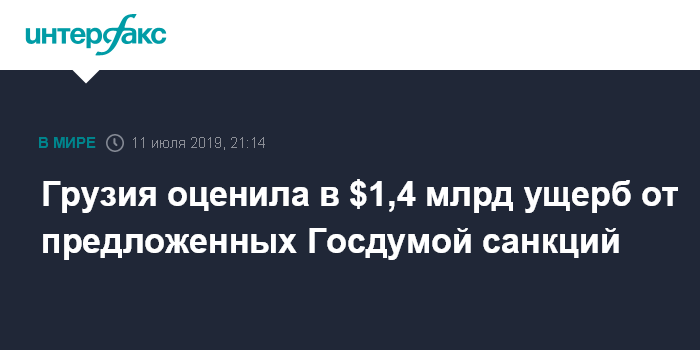Москва. 11 июля. INTERFAX.RU - Министр экономики и устойчивого развития Грузии Натия Турнава заявила, что в случае введения российских санкций против Грузии, которые предлагала Госдума, ущерб составил бы 4 млрд лари ($ 1,4 млрд).