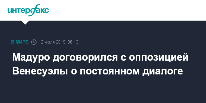 Москва. 12 июля. INTERFAX.RU - Результатом переговоров правительства Венесуэлы и оппозиции на Барбадосе стало достижение договоренности о постоянном диалоге, заявил президент Боливарианской республики Николас Мадуро в своем твиттере.