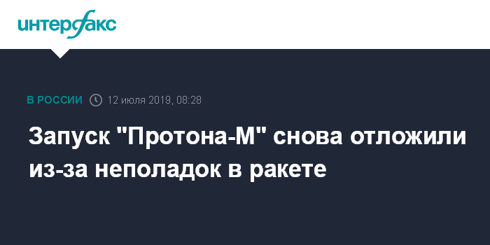 Москва. 12 июля. INTERFAX.RU - Запуск "Протона-М", который должен доставить на орбиту космическую обсерваторию "Спектр-РГ", перенесли на субботу из-за проблем с ракетой-носителем, сообщил в пятницу "Роскосмос".