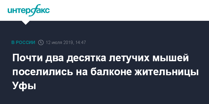 Москва. 12 июля. INTERFAX.RU - Жительница Уфы, обнаружившая на своем балконе нескольких летучих мышей, не смогла прогнать нелегальных жильцов и попросила помощи у спасателей.