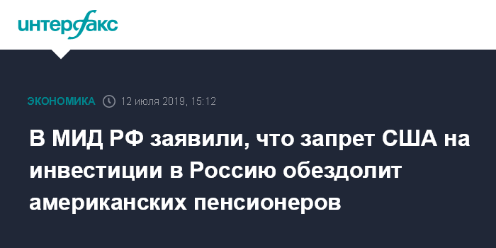 Москва. 12 июля. INTERFAX.RU - Запретами на инвестирование в российскую экономику американские власти лишат доходов своих граждан, включая пенсионеров, заявили в пятницу в МИД РФ, комментируя антироссийские санкционные инициативы в США.
