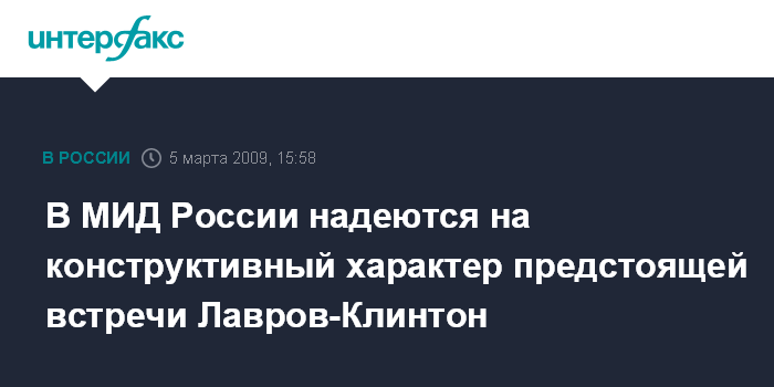 Москва. 5 марта. INTERFAX.RU - В Москве рассчитывают, что предстоящая в Женеве первая двусторонняя встреча главы МИД России Сергея Лаврова и госсекретаря США Хиллари Клинтон пройдет в конструктивном ключе. "Мы надеемся, что все пройдет конструктивно, и настроены на работу", - сказал "Интерфаксу" в четверг источник в МИД РФ.