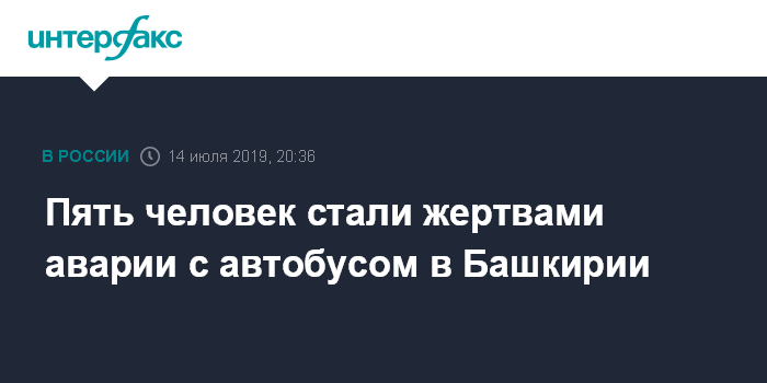 Москва. 14 июля. INTERFAX.RU - По предварительным данным, пять человек погибли в ДТП с автобусом в Башкирии, сообщили "Интерфаксу" в пресс-службе МЧС РФ.
