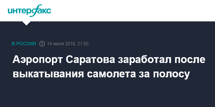 Москва. 14 июля. INTERFAX.RU - Аэропорт "Саратов-центральный" начал принимать самолеты после инцидента с выходом пассажирского лайнера за пределы посадочной полосы.