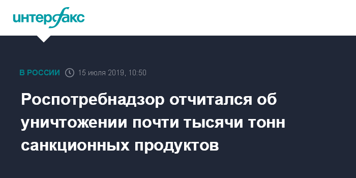 Россельхознадзор ранее сообщал, что на 1 апреля ведомство уничтожило 27 624 тонны санкционных продуктов. Их уничтожают с августа 2015 года. Эмбарго на ввоз продуктов из стран, которые ввели санкции против России, действует с 7 августа 2014 года.