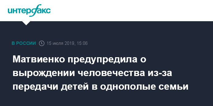Москва. 15 июля. INTERFAX.RU - Если предоставить право однополым семьям усыновлять детей, это приведет к вырождению человечества, считает спикер Совета Федерации Валентина Матвиенко. Она заявила это на Всероссийском молодежном образовательном форуме "Территория смыслов".