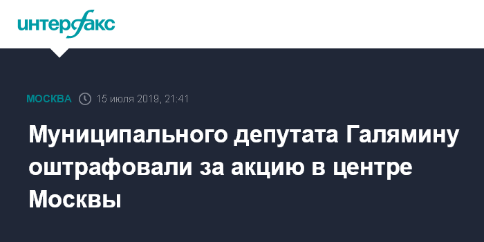 Москва. 15 июля. INTERFAX.RU - Хамовнический суд Москвы в понедельник оштрафовал столичного муниципального депутата Юлию Галямину за участие в несанкционированной акции 14 июля.
